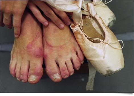 Dancers especially ballet dancers are percieved by many non-dancers to have the most beautiful feet, with the most beautiful point and arches, this is true, however this is only true when they have their shoes on. Ballet dancers are constantly putting so much stress on their feet that they get cracked toe nails, blisters, as well as swollen ankles and many many calluses. Professional dancers go through the pains of being on their feet everyday, but they never seem to have a problem with it because they truly do love to dance and would sacrifice almost anything to do what they love. http://dancetobreathe.blogspot.com/2012/02/kiss-your-foot-modeling-career-au.html